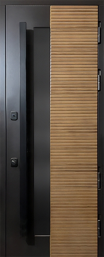 Стальная утепленная термодверь со стеклом, комбинированными плитами МДФ и вертикальной ручкой станет достойным элементом входной группы, подчёркивая статус и вкус владельца. МДФ-панели создают эффект натурального дерева без необходимости сложного ухода. Подчёркивают контраст или плавность перехода между материалами. Оформление подойдет для фасадов с декоративными элементами.