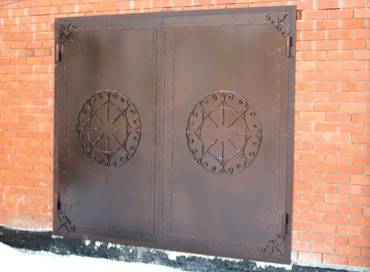 На нашем заводе налажено производство распашных гаражных ворот с глухим полотном и с калиткой в одной из створок. Согласно стандартному проекту, толщина стали составляет 2 мм, однако заказчик вправе выбрать лист большей толщины. Каркас полотна изготавливают из металлического профиля 50×25 мм. Для окраски использована антикоррозийная грунт-эмаль (цвет на выбор). Ворота комплектуются стандартным врезным замком.