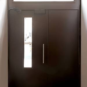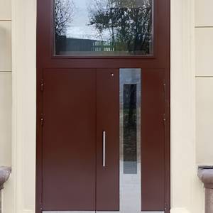 Высокая полуторная дверь с остекленной фрамугой изготовлена по индивидуальным размерам под габариты нестандартного проема. Материал коробки и створок – сталь толщиной 2 мм, окрашенная антивандальным порошковым напылением коричневого цвета.